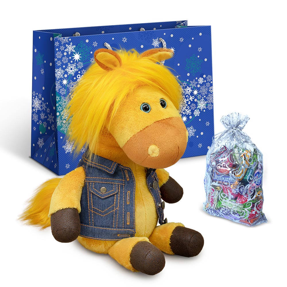 Набор Кори в новогоднем пакете с мягкой игрушкой лошадкой и мешочком со сладким подарком 800г Стандарт.
