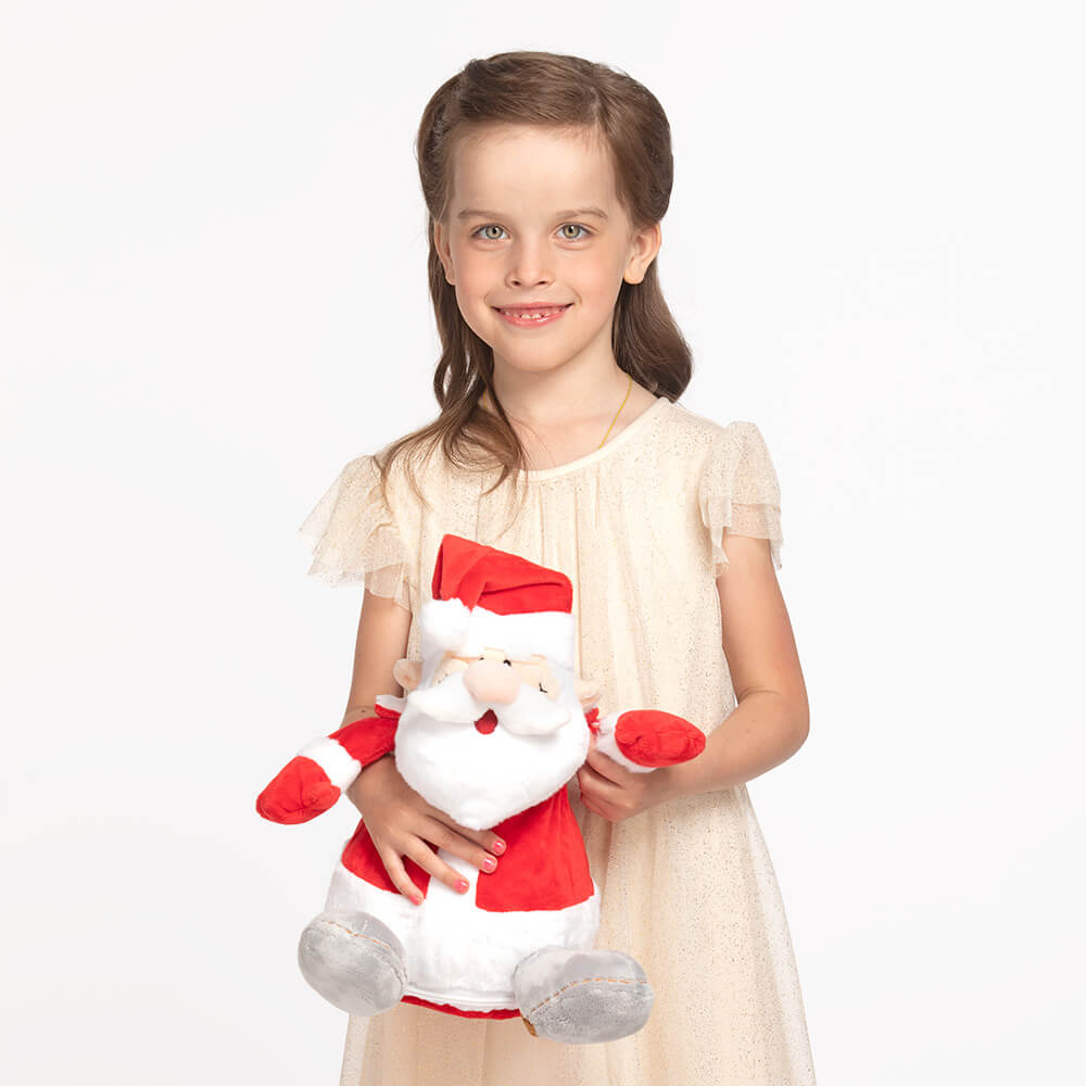 Широко улыбающийся Дедушка Мороз с густой бородой, в классическом костюме с отделкой из белоснежного меха — красный кафтан с воротником, шапочка с помпоном, варежки и валенки. Глаза и улыбка сделаны вышивкой.